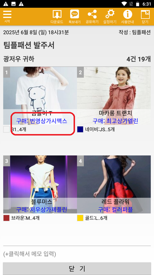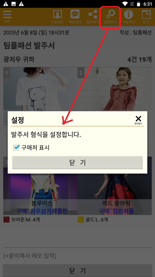 위와 같이 구매한 곳이 표시됩니다. 이를 이미지로 다운받아 사입담당 직원에게 보내면 됩니다. 표시는 아래 설정에서 할 수 있습니다.
