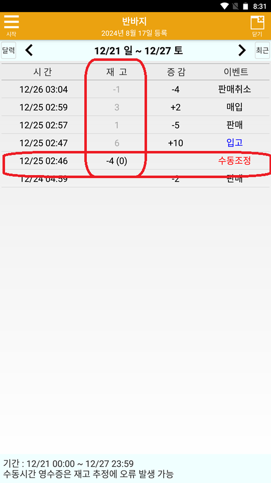 베타버전에서는 재고숫자도 함께 표시됩니다. 현재부터 수동조정까지 숫자입니다. 만일 수동조정에 ()가 있다면 영수증 시간을 수동으로 변경해서 입력했을때 발생할 수 있습니다.