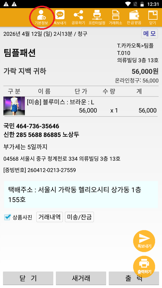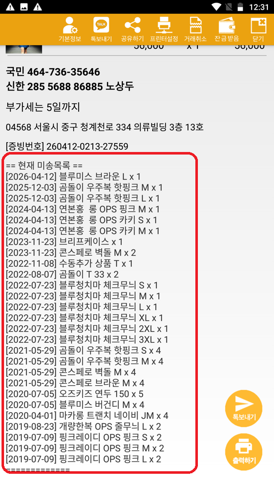 고객에게 영수증을 드릴때 현재 미송목록을 같이 보내드릴 수 있습니다. 이 글 공유하기: X에 공유 (새 창에서 열림) X Facebook으로 공유하기 (새 창에서 열림) Facebook 좋아하기 가져오는 중...