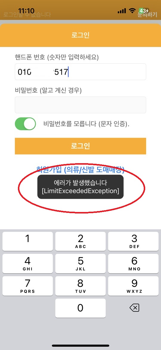 주의 – 짧은 시간동안에 로그인 요청을 너무 많이 보낸 경우